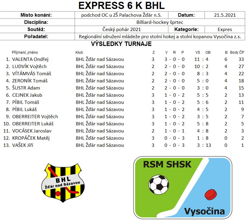V pátek 21. 5. 2021 se ve Žďáře nad Sázavou uskutečnil další z turnajů Českého poháru 2021. Po úterní zkušenosti s přerušováním kvůli dešti, bylo za soutěžní místo zvolen podchod obchodního centra u ZŠ Palachova. Tato volba se ukázala jako výborná, neboť před posledním kolem se rozpršelo. Ačkoliv se nehrálo ve zcela komfortních podmínkách, účastníkům to nijak nevadilo. Pořadatele pak zejména potěšila vysoká účast mladých hráčů z Hamrů nad Sázavou, kteří tak trochu neočekávaně proházeli rozlosování turnaje. To mělo za následek také volná kola pro některé z hráčů a tím pádem manko do celkových výsledků turnaje pro některé z favoritů. Co byl pro někoho hendikep, pro jiného byla výhoda. Vítězem turnaje se tak stal pro některé možná překvapivě, pro znalé místní situace méně, Ondřej Valenta, hráč z kategorie mladší žáci. Ten totiž dokázal zvítězit jako jediný hned třikrát.
